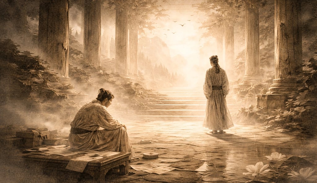Shall I rather speak forth in anger, laying bare my sincerity, uttering words of rectitude before the imperial court, refusing to bow to princes and lords? Or shall I abase myself in weakness and compliance, fawning upon command, to become one who flatters with his face and serves with his tongue? Shall I be gentle and broad in kindness, bestowing favor without seeking its return? Or shall I chase after worldly gain, yielding and conniving for hollow accord? Shall I live in seclusion and walk in righteousness, pursuing the utmost sincerity? Or shall I exalt false show and cunning deceit, nourishing a hollow name? Shall I cast out the wicked and flatterer, hold firm to uprightness and never bend, judging clearly what is worthy and what is base? Or shall I act with mocking arrogance and slippery wit, grasping at cleverness and relying on artifice, becoming a mere bag of tricks? Shall I hide my scales and colors, like the dragon concealed in the deep? Or shall I spread my wings and cry aloud, like the swan soaring through the clouds? Shall I transform my form outwardly while concealing my heart within, bending my body to suit the times, sinking nameless beneath the world’s surface— dwelling among men, yet truly abiding in the dark? Or shall I rouse myself in proud clarity, sharpening my thought to brilliance, walk apart from the world yet keep my heart with the crowd, so that wherever I go, my name is known, my days consumed in restless striving? Shall I live spare and free, with nothing to boast or claim, making no distinction of self and others, content in peace, neither contending nor yielding, wandering with a pure and shining mind until I sit in sudden forgetfulness— seeking to follow Fu Xi and Shen Nong, yet falling short, walking the Middle Way, yet sorrowing still? Or shall I stir my heart to valiant feeling, exalting passion as brightness, pressing upward to defy the throne of ten thousand chariots, and downward to challenge the ministers of state, holding my countenance in proud restraint, raising myself high in self-assertion, forever as one who has lost his post, nursing resentment and bitter regret? Shall I amass a thousand millions in treasure, strike the bells and dine from tripods, recline among fragrance and delicate beauty? Or shall I toil and exhaust my strength, clearing away the thorns and briars, dwelling in the mountains, drinking from the valleys, and resting by the cliffs?