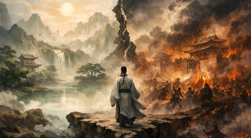 He whose embodied spirit abides in numinous clarity, who exhausts principle and reaches the utmost subtlety—though he sit in stillness within a quiet hall, yet is he mystically one with that which lies beyond the four seas. Thus he rides upon the Two Modes and guides the Six Breaths; he joins himself with humankind and drives the ten thousand things. If there be nothing that does not accord with him, then the drifting clouds become his chariot; if there be no form that does not bear him, then the flying dragon becomes his mount. Casting aside the body yet attaining himself, he remains serene and free from all dependence. Seated, he forgets the seat; walking, he forgets the path; in forgetting, he brings all into being...